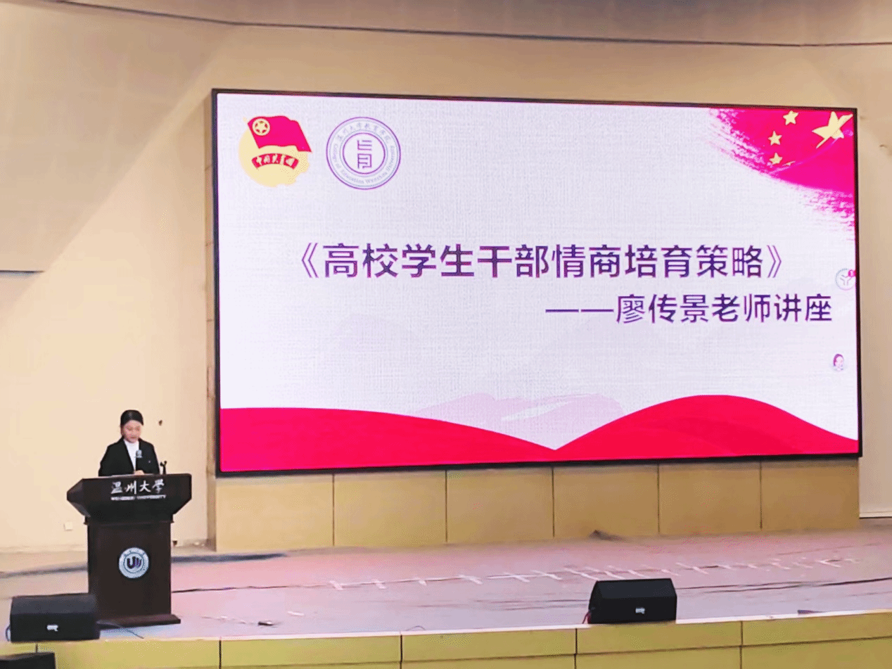 随后,廖老师简要阐释情商的核心内涵——自我认知、情绪控制、他人情绪识别、自我激励与人际交往五大维度,并用复旦投毒案、温州火锅店冲突等案例,警示情绪失控的严重后果。在经验分享环节,廖老师分享了诸如微笑待人、真诚尊重、避免炫耀等简单实用的情商提升技巧,鼓励学生干部在服务同学、对接老师的实践中锻炼沟通协调能力,在日常相处中涵养共情包容之心。