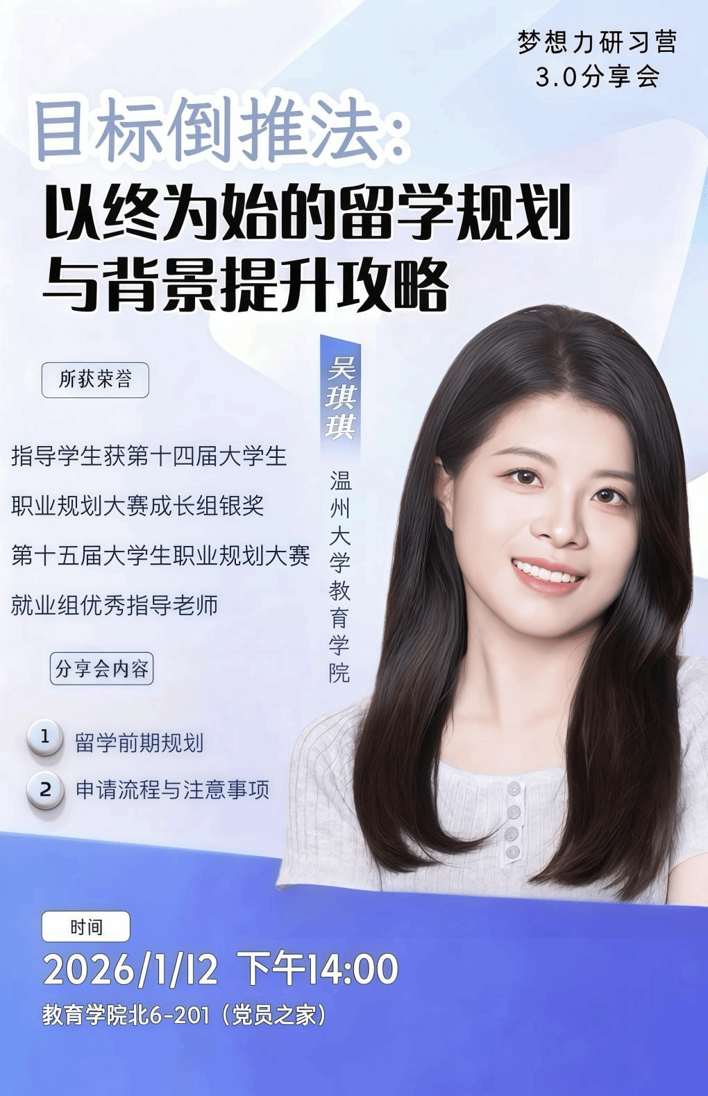 1月12日下午,温州大学教育学院“目标倒推法”留学规划分享会在学院党员之家温馨举行。辅导员吴琪琪老师以自身海外求学经历与多年升学指导经验,为线上线下有志于出国深造的同学带来一场既有干货又有温度的分享。