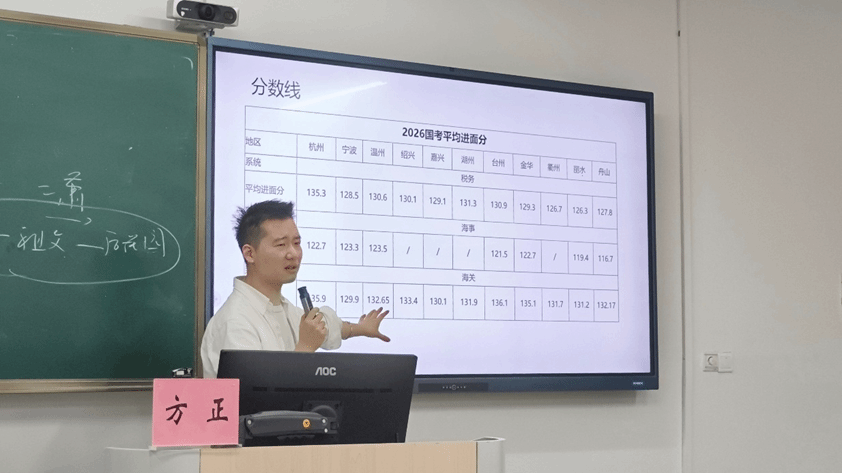 在备考指导环节,方老师简要介绍了行测与申论的题型构成,并结合浙江省考纲特点指出,浙江公考命题具有较强的规律性,掌握核心考点可事半功倍。同时,他还对几类热门岗位进行了简要分析:税务系统作为国考招录大户,岗位覆盖面广且内部设有轮岗机制;海事系统适合乐于外勤的同学,兼顾外出与办公室事务;行政执法类岗位待遇优厚,女生多从事后台支撑工作;街道办事处等基层岗位离家近、招录人数多,是实现“家门口就业”的不错选择。方老师建议同学们结合自身性格特点与职业规划,理性选择最适合自己的报考方向。