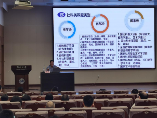 会议开启“强师兴院·卓越研教”专项指导系列活动,第一场邀请校人文社科处处长胡瑜教授为全院教职工作题为《社科类项目申报技巧与案例分享》的专题讲座。胡处长结合自身深厚的学术积淀和丰富的实践经验,旁征博引,通过典型案例,以“三者一体的综合视角”,从问题意识、选题策略、论证方法等多个关键维度进行了深入细致的阐释与分析。许多老师表示收获颇丰、受益匪浅。后续学院将持续开展“强师兴院·卓越研教”专项指导系列活动,助力学院教职工专业发展。