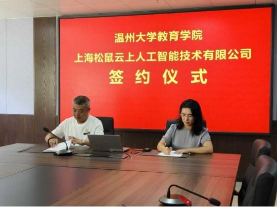 为深入拓展毕业生就业渠道,推动人才链与创新链精准对接,2025年9月25日,温州大学教育学院与上海松鼠云上人工智能技术有限公司举行合作签约仪式,共建“人工智能赋能学习创新实验室”。此举是我院深化“访企拓岗”专项行动、以校企合作促高质量就业的重要举措。上海松鼠云上人工智能技术有限公司智委会主席徐军先生一行,我院副院长柳晨晨、教育技术学科负责人杨刚教授等出席仪式。