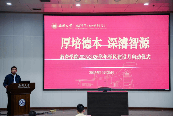 2025年10月29日,温州大学教育学院2025/2026学年学风建设月启动仪式在北校信息楼报告厅隆重举行。作为教育部立德树人综合机制改革试点单位,学院以学风建设月为重要抓手,正式启动“三全育人”深化改革行动,着力构建“学风铸魂、实干聚力”的育人新格局,为培养新时代“大先生”后备军奠定坚实基础。学院党委副书记兼纪委书记章志图、副院长孙忠强出席活动,各系各科室师生代表共同参与,共话学风建设新使命,齐启育人奋进新征程。