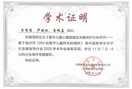 教育学院2023级小学教育专业本科生吴想想、雷施嘉同学在严晓秋副教授指导下撰写的《留守儿童心理困境及关爱保护机制研究——基于温州市1204份留守儿童样本的调研》论文,经组委会严格审核后,受邀在“中小学心理健康教育的理论与实践”分论坛作专题报告。作为分会场唯一作报告的本科生,吴想想同学从理论框架构建、“小候鸟”留守儿童心理健康现状调研、“10+7+3”疗愈体系创新及智能体开发等方面进行了深入汇报,其研究的实践导向与前沿视角得到与会代表的充分肯定与积极好评。
