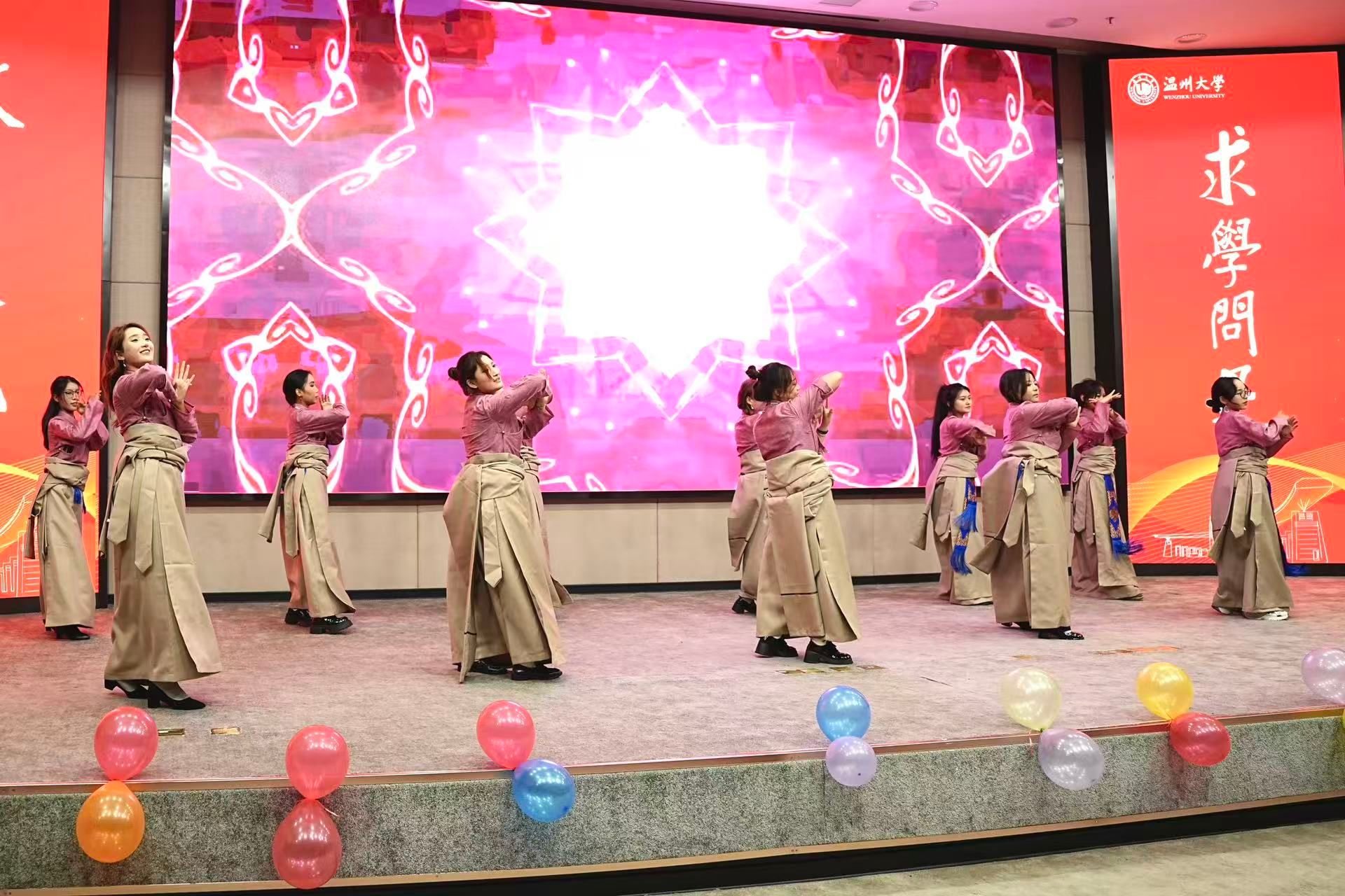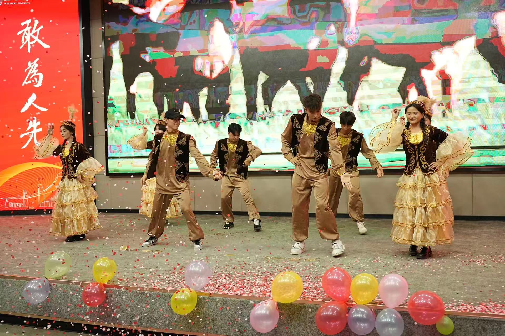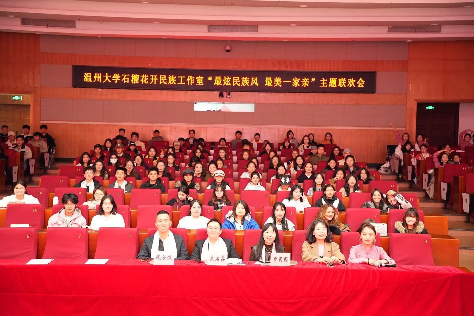 温州大学党委统战部常务副部长朱启鑫,校党委学生工作部副部长、人武部副部长钱合激,教育学院党委副书记、“石榴花开”民族工作室负责人章园园,以及工作室指导教师与在校各族学生欢聚一堂,共同见证了这场精彩纷呈、温情洋溢的民族文化盛会。
