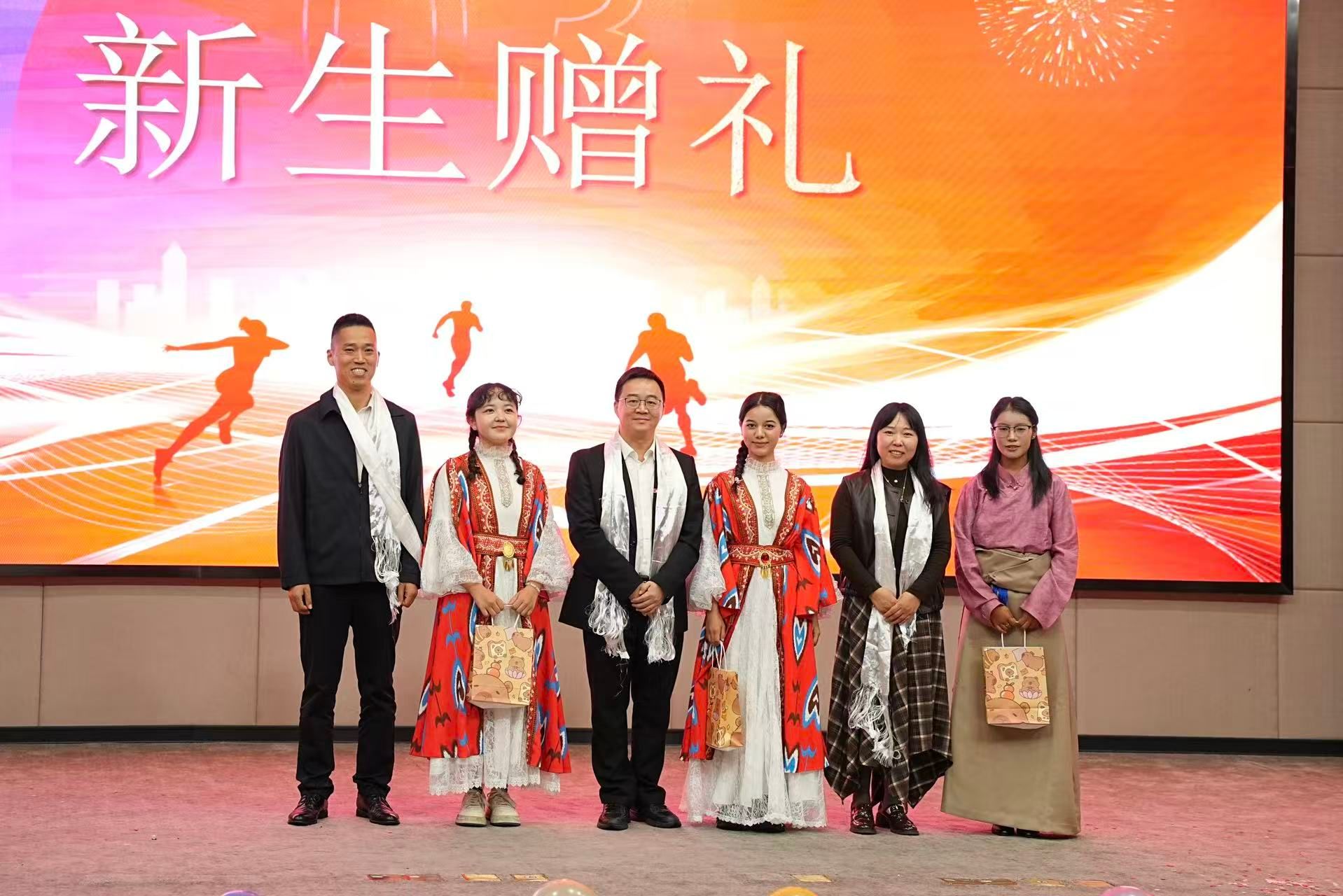 致辞环节后,迎新献礼仪式温情登场。领导们向新生代表赠送暖心入学礼包,传递来自学校大家庭的温度与祝福。身着各民族服饰的新生代表向老师们敬献洁白哈达,表达对教育与关怀的感恩之情。一份份礼物、一条条哈达,汇聚成“尊师重道、团结互助”的美好画面,象征着民族团结之花在温大校园中蓬勃绽放。