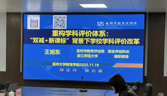 11月19日,温州大学教育学院“溯初大讲堂”2025年第12期学术活动如期举行。本期讲堂以“重构学科评价体系:‘双减 + 新课标’背景下学校学科评价改革”为主题,特邀温州市教育评估院综合评估科长、浙江师范大学兼职硕士生导师王旭东老师,为师生带来一场兼具政策高度与实践深度的专题讲座,吸引了来自我院心理系、小教系、学前系的众多师生参与。教育学院孙忠强副院长主持活动。
