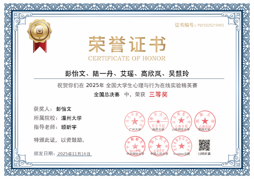 第三届全国大学生心理与行为在线实验精英赛,既是一场汇聚全国高校心理学创新成果的国家级高水平赛事,更是一次检验高校人才培养质量与学科建设水平的权威亮相。我院学子在此次赛事中取得优异成绩,既展现当代大学生勤学善思、锐意进取的风貌;更彰显温州大学教师教育学院心理系育人硬实力。此荣誉既是师生同心的结晶,更是学院深耕心理学学科、坚守育人初心的有力印证。