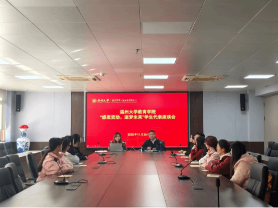 在温州大学第十二届校园师生节火热开展之际,11月26日下午,作为教育部立德树人综合机制改革试点院系,教育学院在北校8 - 204会议室举办“感恩资助,逐梦未来”学生代表座谈会暨爱心助学金发放仪式。学院党委副书记兼纪委书记章志图,学工办辅导员、步青学区先锋党支部书记王伊如,以及受资助学生代表共同参与这场融合资助育人、文化浸润与价值引领的特别活动,展现校园师生节“尊师重教、关爱师生”的核心精神。本次活动由步青学区先锋党支部组织举办。