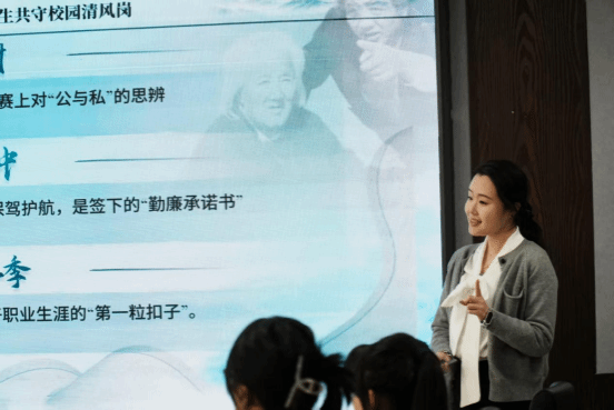 赛后,评委代表周奇老师对选手表现进行了精彩点评。她充分肯定了微课作品的创意性与感染力:“许多作品将廉洁教育与校园生活紧密结合,既有理论高度又有情感共鸣,真正做到了‘让廉洁教育活起来’。”同时,她也从内容架构的逻辑性、案例选取的典型性、情感传递的共鸣度等方面提出了优化建议,例如“可进一步挖掘身边典型案例,增强说服力”“情感表达需更自然,避免说教感”。最后,周奇老师以一句发人深省的话作结:“廉洁不是别人的要求,是自己的人生滤镜——无论是否有人监督,做事能问心无愧,就是最好的廉洁。”这番总结引发在场师生的深刻共鸣,让大家对“廉洁”的理解从“外在约束”升华为“内在自觉”。