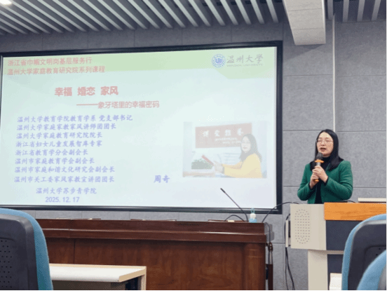 2025年12月17日下午,温州大学南9C301报告厅,一场以"幸福·婚恋·家风——象牙塔里的幸福密码"为主题的精彩讲座在此举行。温州大学教育学院教育学系党支部书记、家庭教育研究院院长、浙江省巾帼文明岗岗长、温州市家庭和谐文化研究会副会长、温州市关工委家风家教宣讲团团长周奇教授,为苏步青学院全体2025级新生带来了一场关于大学生活幸福之道的深度分享。作为浙江省高校“双带头人” 教师党支部书记工作室负责人,这次活动也是其牵头开展的“强国行”系列行动之一。