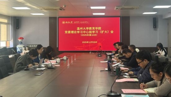 2025年12月30日下午14:00,教育学院在北校8-204会议室举行2025年度第10次党委理论学习中心组学习(扩大)会。校党委委员、副校长刘玉侠率巡听旁听组到会指导,学院领导班子成员及相关科室(系所)负责人参加会议,学院党委书记张敏主持。会议聚焦“强化使命担当,服务温州发展,推进高水平大学建设”主题,将学习贯彻习近平总书记给天津大学、中国农业大学师生回信精神作为“第一议题”,并学习贯彻温州市委十三届九次全会精神,开展高水平大学建设办学理念大讨论。