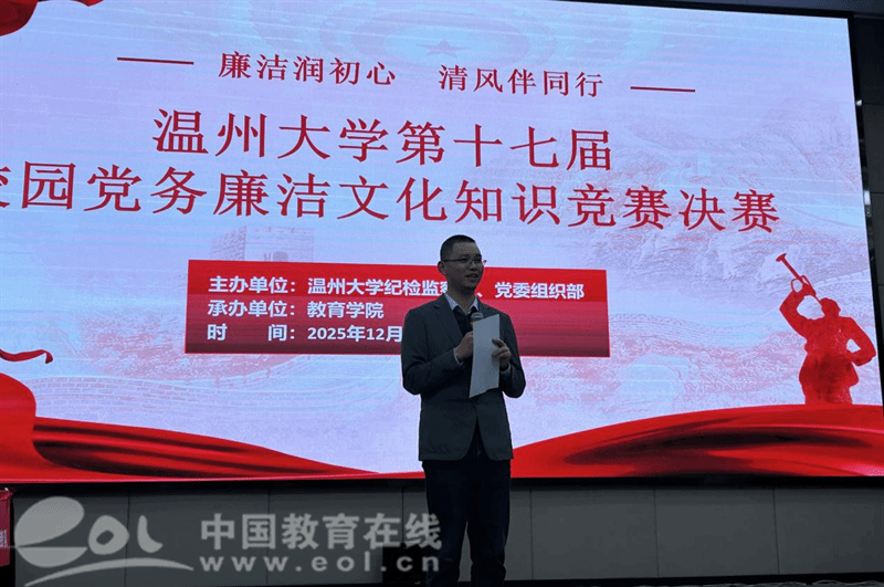 12月4日晚,温州大学第十七届校园党务廉洁文化知识竞赛决赛在育英图书馆二楼报告厅成功举办。本次活动以“廉洁润初心,清风伴同行”为主题,由纪检监察室、党委组织部共同主办,教育学院承办。校纪检监察室副主任柯宇航、校党委组织部干部科科长林玉双、教育学院党委书记张敏,以及各参赛学院纪委书记、师生代表共同参与。