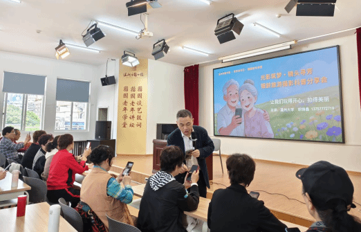 4月23日上午,温州市图书馆第二届“籀园银龄汇·梦看籀园花”银龄读书节文艺美育板块精彩“落地”,“光影筑梦·镜头寻芳”银龄旅游摄影科普分享会温情开讲。活动特邀专业摄影师胡铸鑫授课,聚焦老年群体出行摄影刚需,以适老化、实操型教学解锁手机摄影技能。线下吸引约80位老年读者到场学习,线上直播观看突破4000人次。