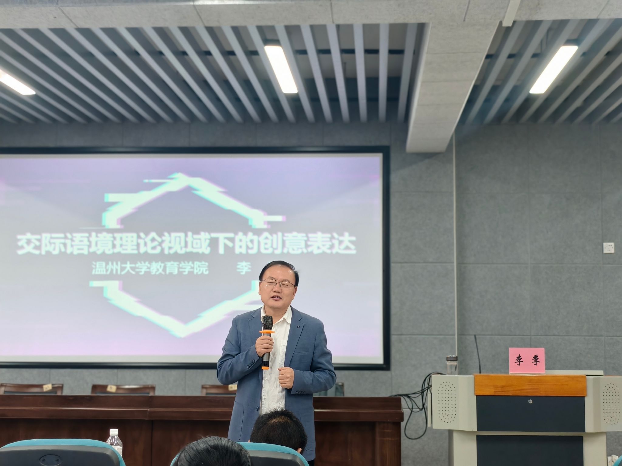 下午,温州大学教育学院李季博士以《交际语境理论视域下的创意表达》为题开讲,从写作作为作品、写作作为过程、写作作为交流三大核心视角切入,结合交际语境要素,深度阐释创意表达教学的实践路径。