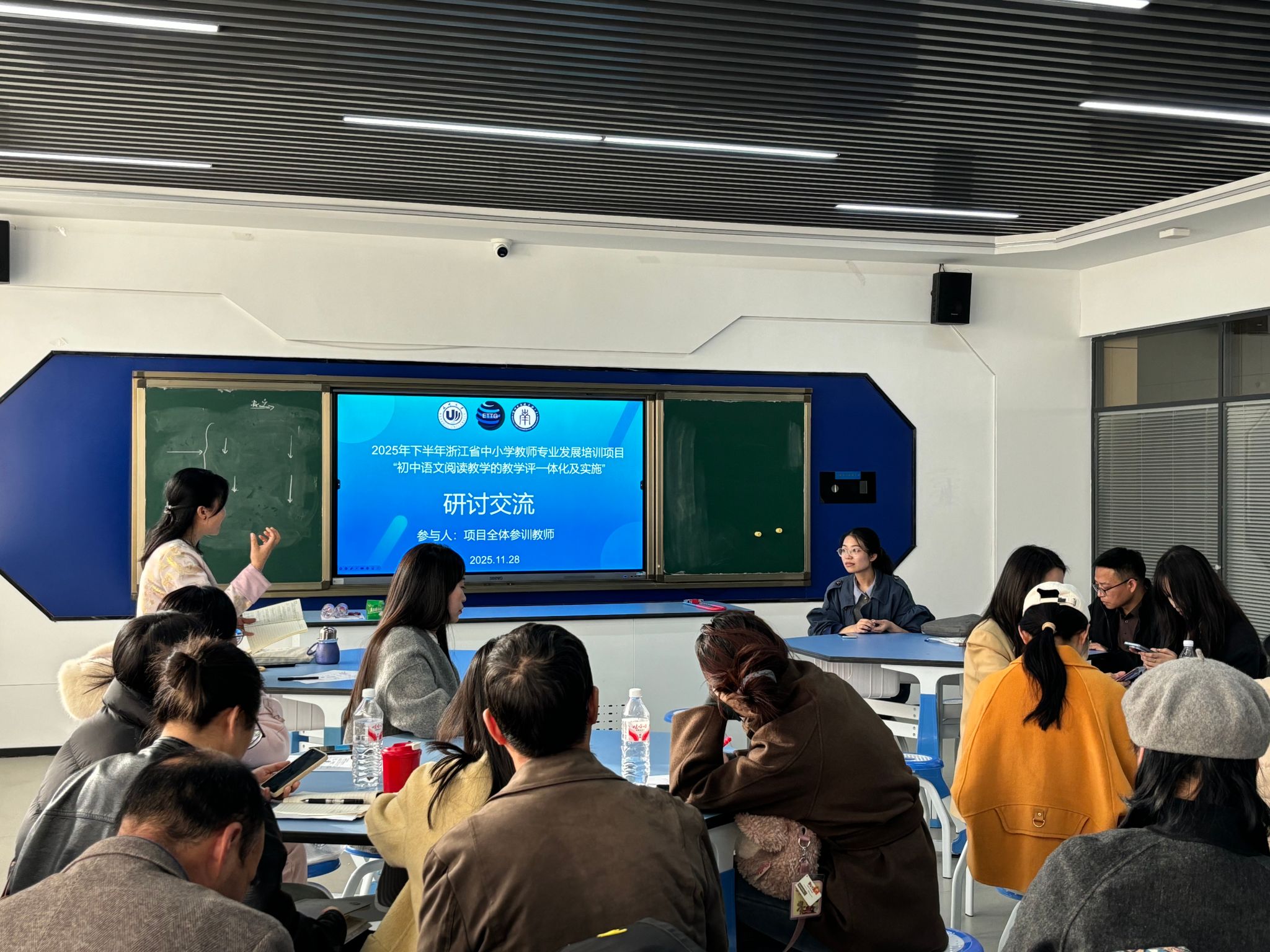 2025年11月28日-30日,浙江省中小学教师专业发展培训面省项目“初中语文阅读教学的教学评一体化及实施”在温州大学学院路校区圆满落幕。项目旨在切实提升初中语文教师 “教学评”一体化实施能力,打造一支素质过硬、专业精湛的教师队伍,推动初中语文教育教学质量稳步提升。本次培训由温州大学教育学院教育智库与治理研究中心(ETTG)主任付睿教授主持,汇聚了温州大学教育学院特聘副教授、李季博士,温州榕园学校语文教研组长王汉雷老师、温州市南浦实验中学刘靖靖老师等骨干师资,温大教育学院培训中心郑潇丽老师担任班主任。来自杭州、温州、丽水、宁波、台州、金华等地的40多名初中语文教师参与了本次培训。