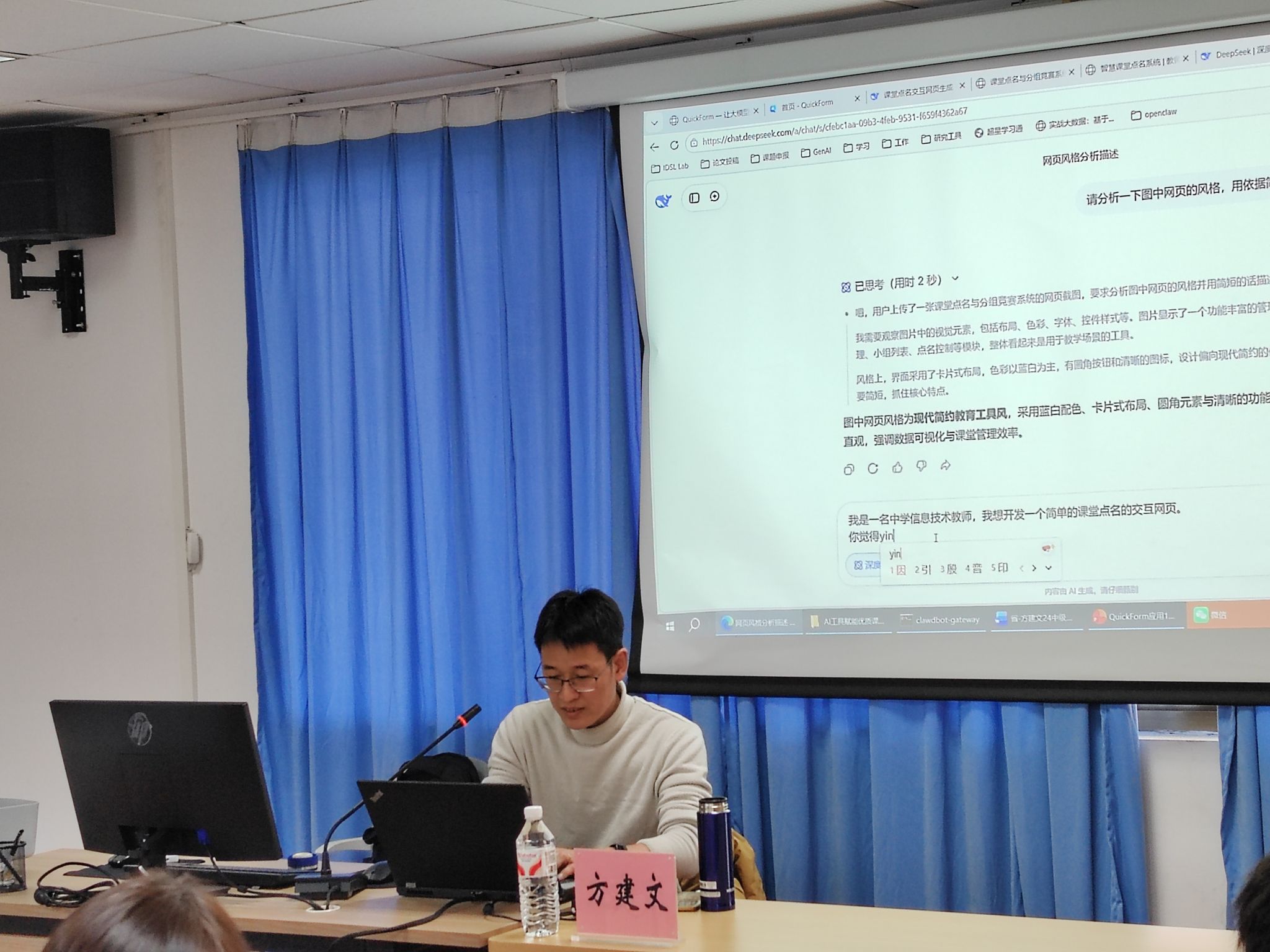 培训首日上午以quickform使用:AI生成教学交互网页为主题,由温州大学方建文博士担任主讲。课程围绕AI技术在教学场景中的实际应用展开,通过案例演示与实操练习,帮助教师掌握智能备课系统、个性化学习分析等工具的使用方法。方博士强调:“AI不是取代教师,而是通过数据赋能让教学更精准。”现场学员在模拟课堂中体验了AI学情分析系统,实时获取学生答题数据并生成个性化辅导方案,不少学员表示“重新认识了技术与教学的结合点”。