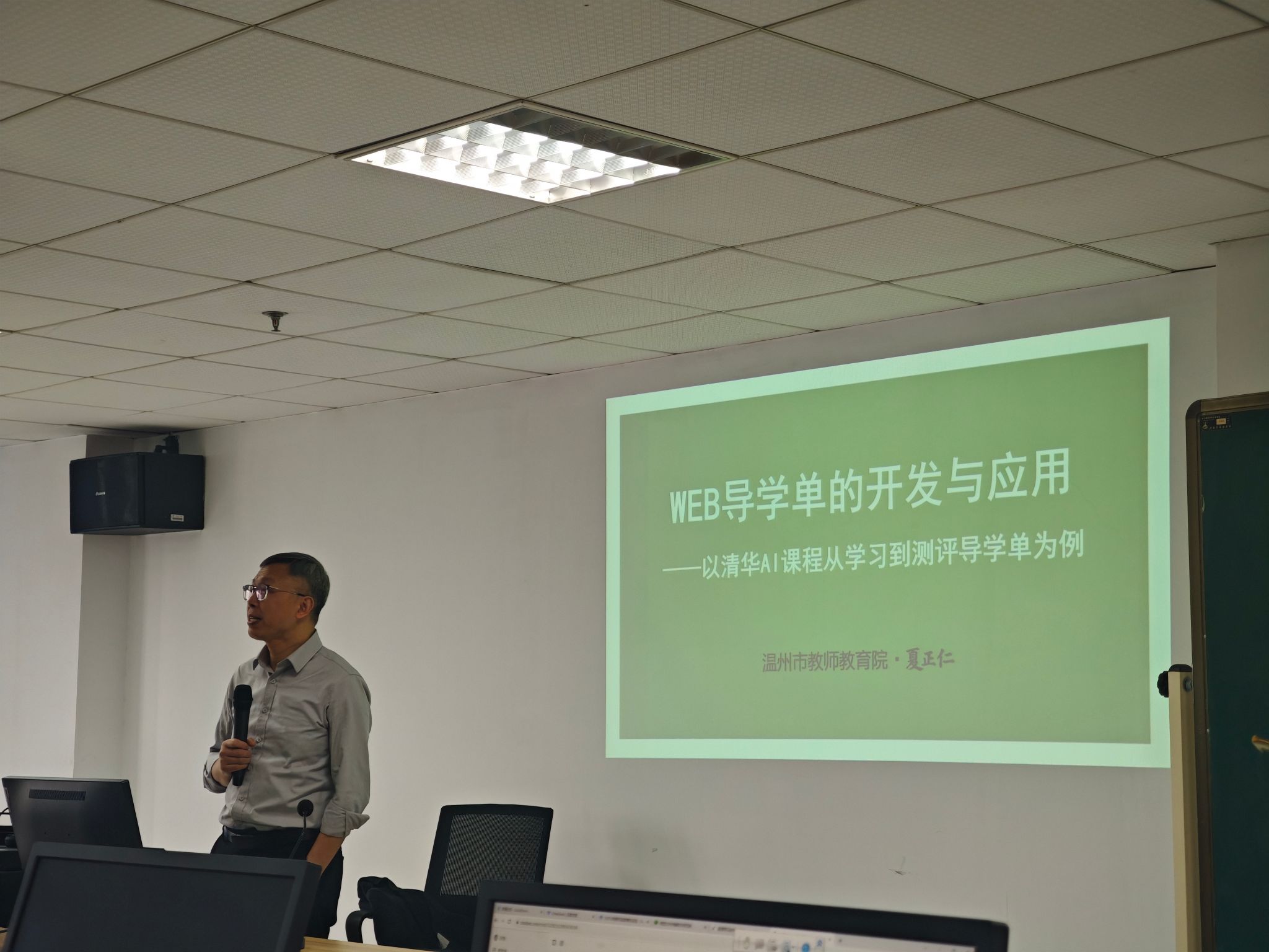 最后一天的“Web导学单开发与应用”课程由温州市教师教育院夏正仁主讲。课程突破传统纸质学案模式,指导教师利用开源平台搭建交互式学习页面,集成视频讲解、即时测验、资源链接等多元要素。上午的课程以清华AI课程从学习到测评导学单为例,围绕系统化的设计目标展开,通过案例解码剖析AI清华课程的编写原则,深入探究学理基础,并分享了丰富的开发经验,引导教师思考当前学生需要哪些课程以及教师专业能力提升的相应要求。下午进入现场制作案例探讨环节,学员们分别对自己的教学案例进行介绍,在成果展示中,“实验虚拟仿真系统课例”“古诗词沉浸式学习页面”等作品获得专家高度评价。
