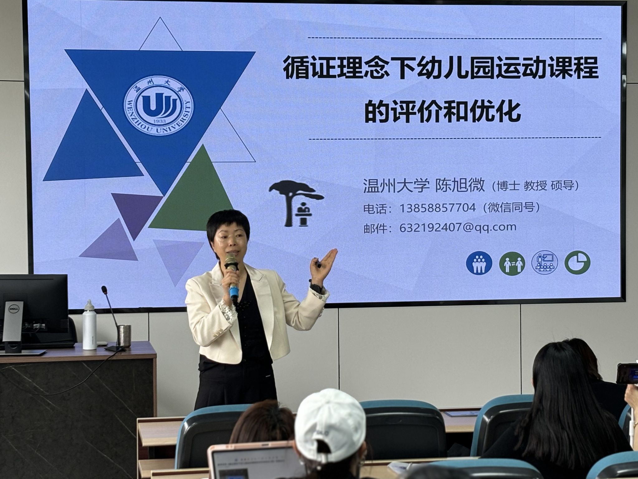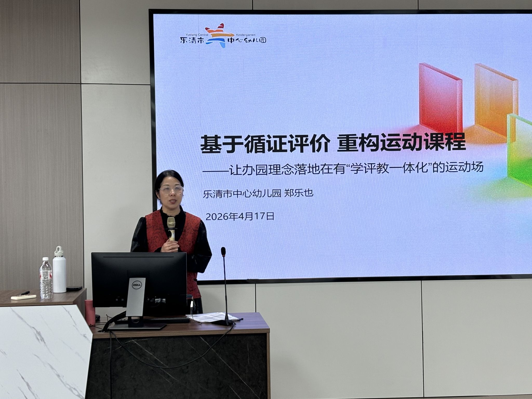 16日下午,由乐清市中心幼儿园园长郑乐也带来《基于循证评价 重构运动课程——让办园理念落地在有“学评教一体化”的运动场地》的专题讲座。