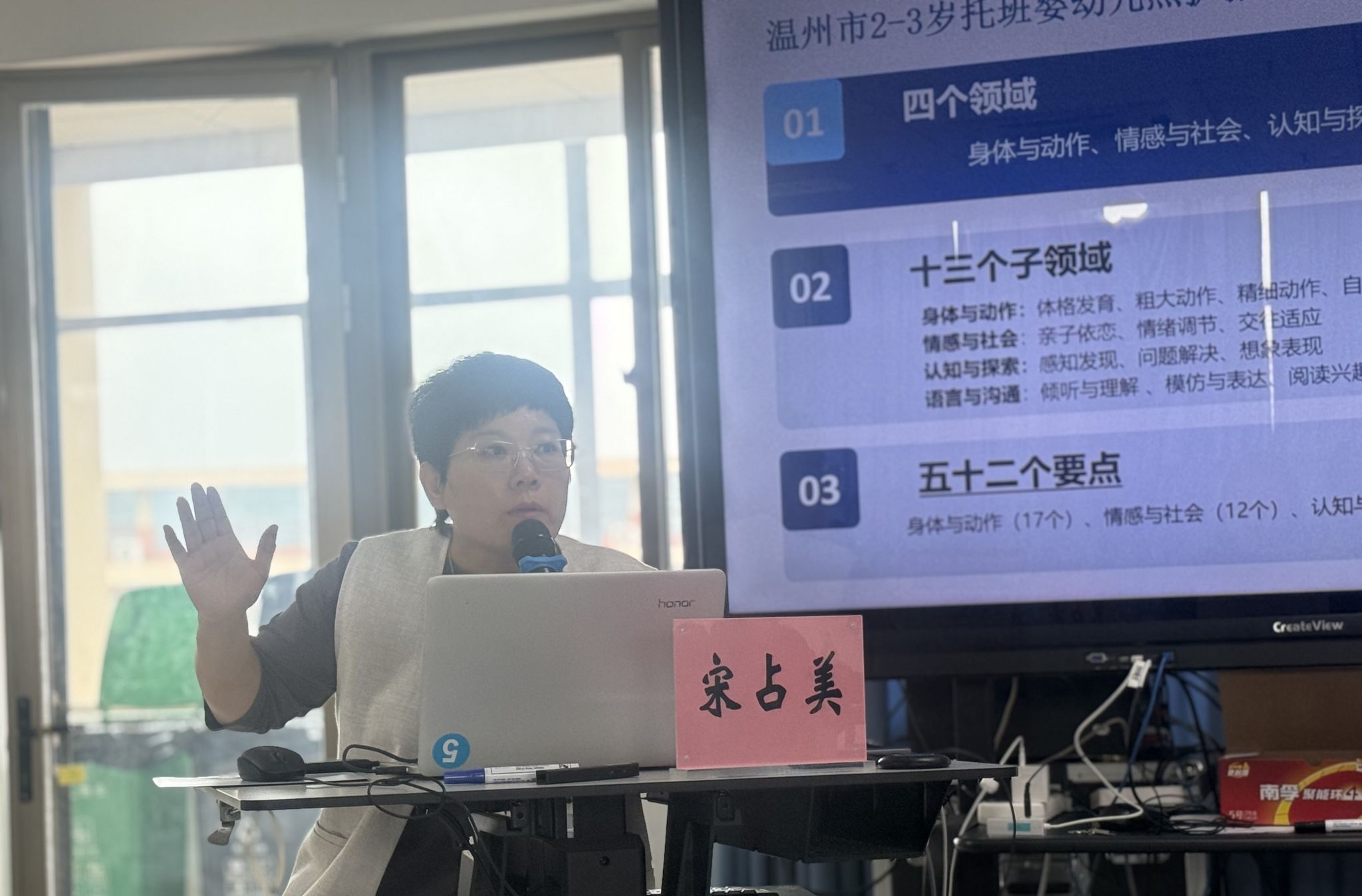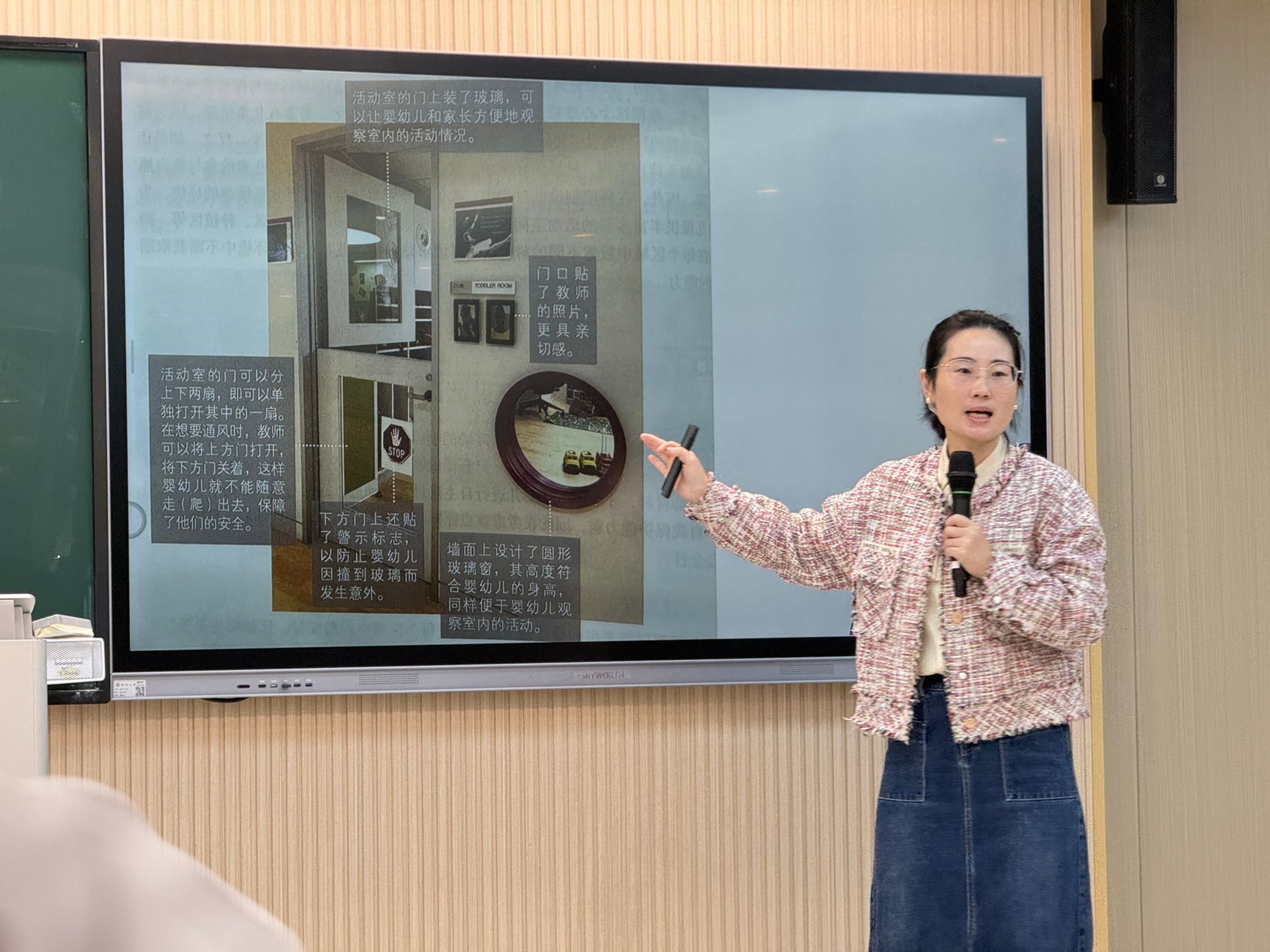 当天下午,高瑾老师继续围绕托班课程的核心特点与实践路径展开培训。她明确强调:托班不是小班缩小版。2-3岁幼儿以感官和动作探索世界,注意力时间短、自我意识萌芽,课程需以“回应性照护”为核心,聚焦生活自理、情绪调节与安全感建立。高老师提出四大活动设计原则——低结构化、多感官参与、过程重于结果、适度混龄,并结合感官探索、生活操作、大肌肉运动、艺术表达、语言律动五大活动类型,提供大量实操案例与可直接套用的设计步骤。她倡导“会说话的空间”,让环境成为幼儿的“第三位老师”。