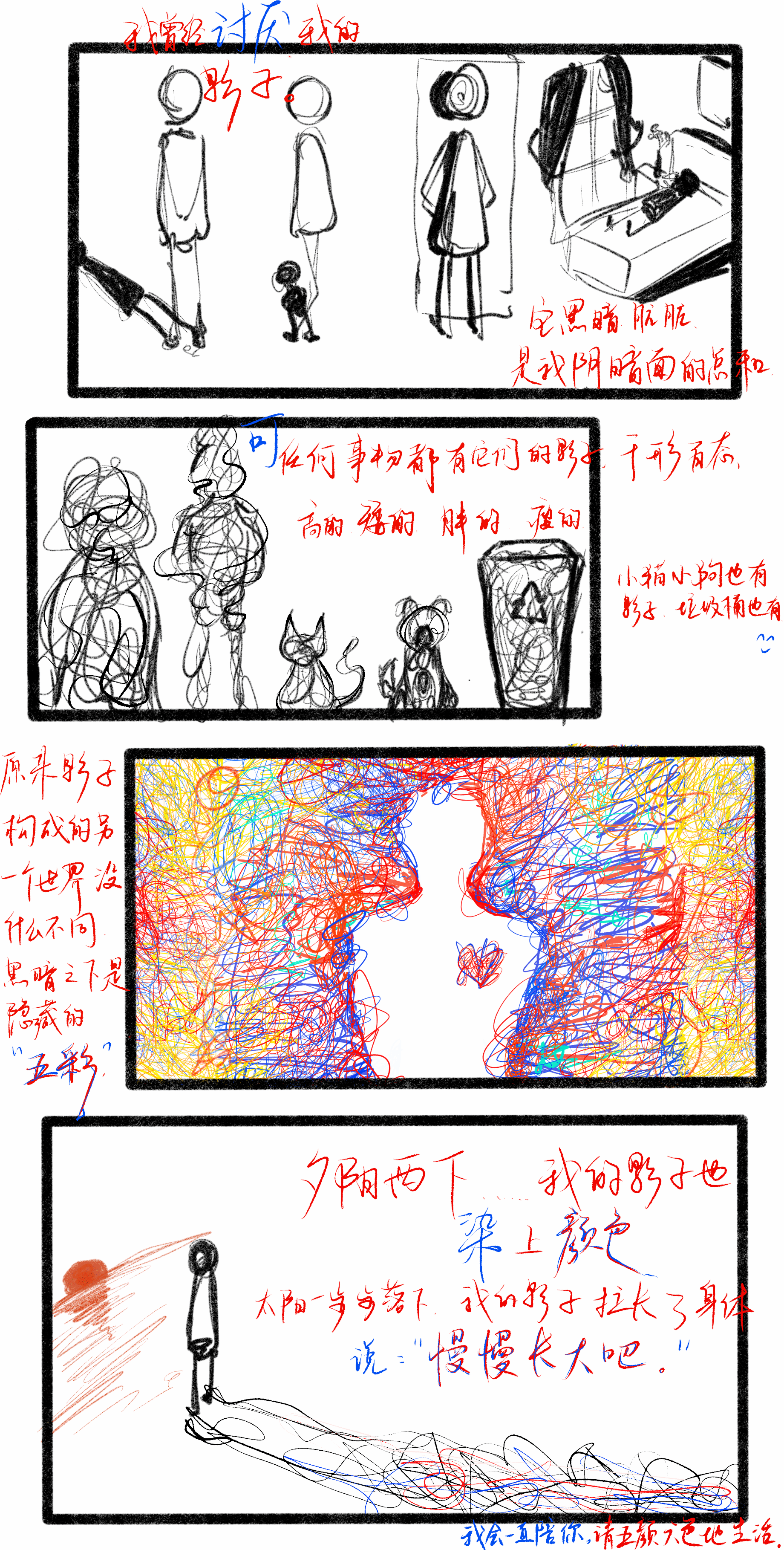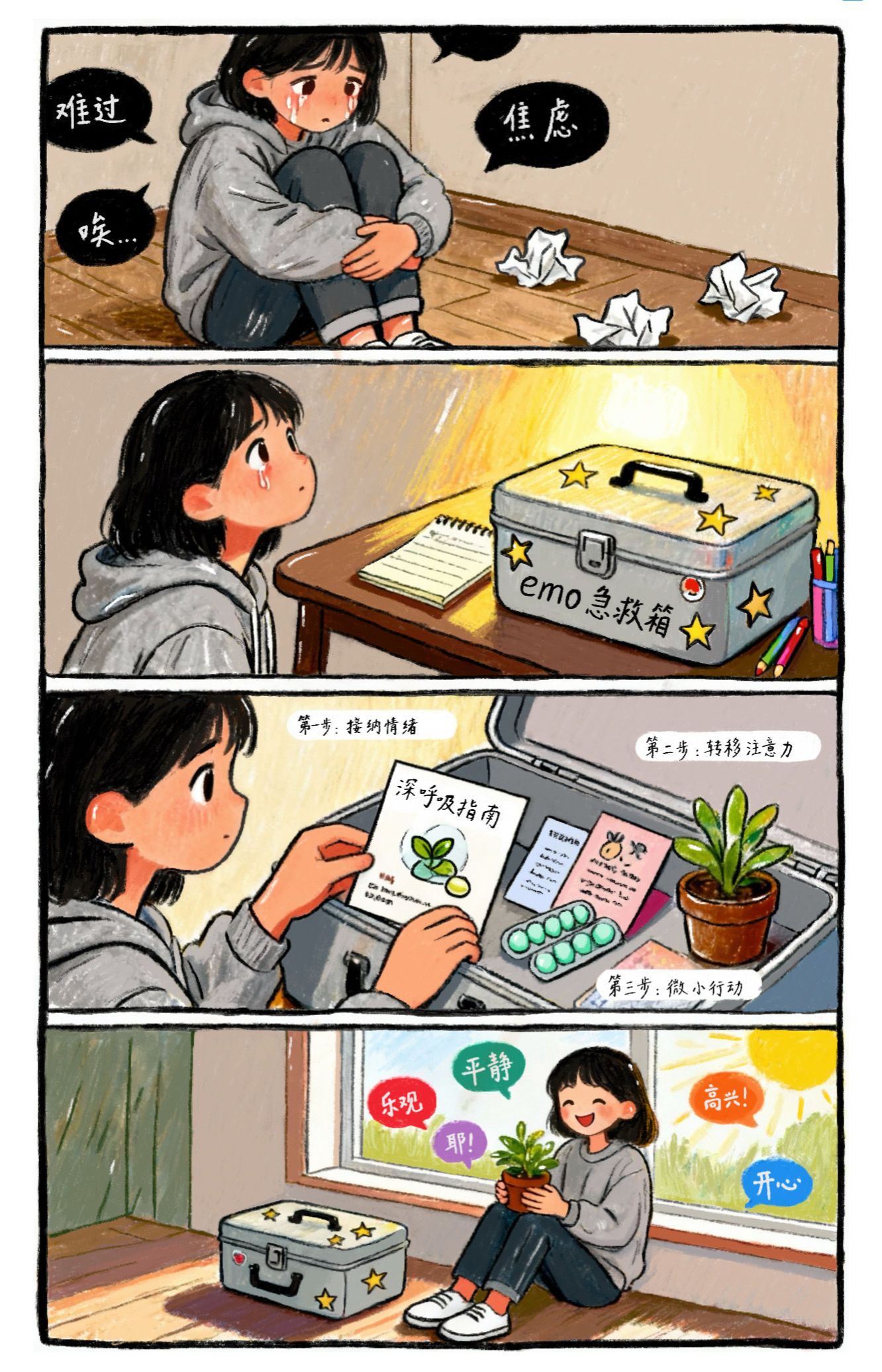 自大赛启动以来,得到了全校学子的热烈响应和积极参与,共征集到参赛作品100余份。参赛作品紧扣“积极心理”核心主题,同学们以细腻的笔触、生动的画面和鲜活的情节,将大学生活中的成长感悟、情绪变化、人际互动等心理体验转化为直观的漫画语言,内容涵盖自我接纳、压力调适、友谊滋养、逐梦成长等多个维度,兼具思想性与艺术性。商学院许左右同学创作的《影子》将目光聚焦在大学生的复杂的自我意识和成长上。教育学院研究生钱嘉仪则通过《emo急救箱》讲情绪急救手段具象化,将情绪调节方法可视化,倡导同学们学会用小步骤疏导情绪,搭建心理支持的“急救站”,重视对自己情绪的关照。